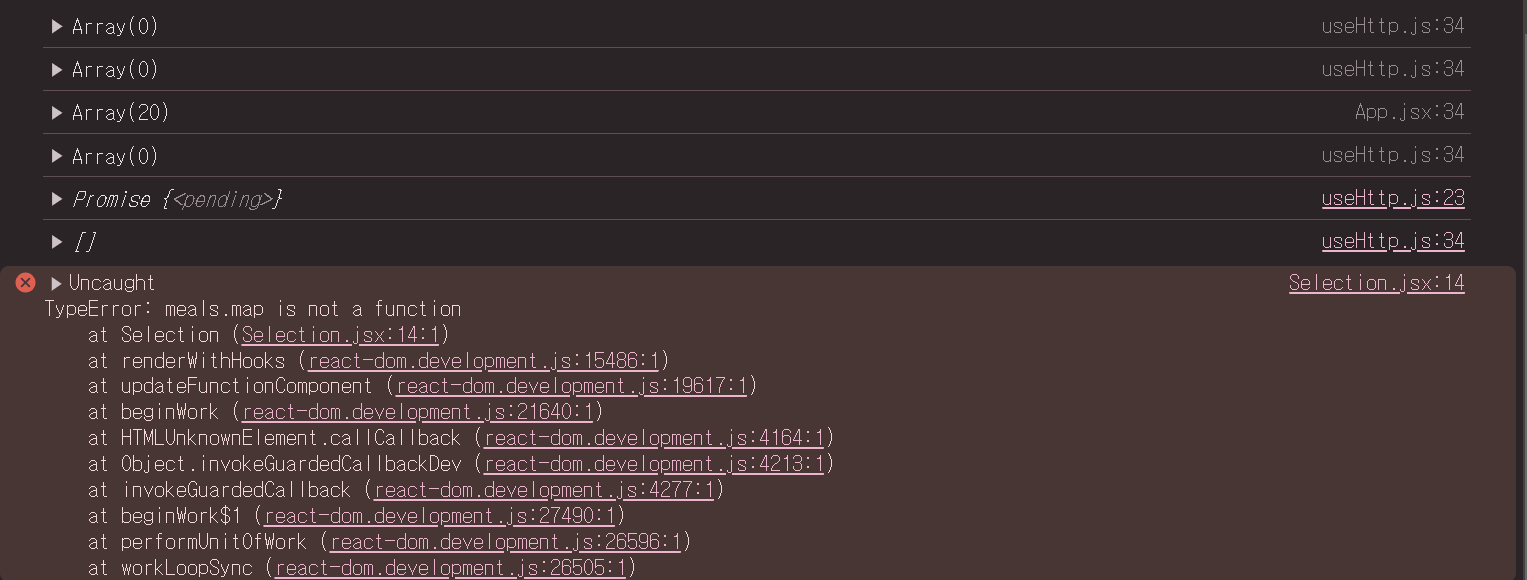 콘솔에 배열이 찍힌 것을 보아 데이터는 잘 가져온 것을 볼 수 있다. 그런데 meals.map이 not a function이라는 것을 보아 배열 형태가 잘못된 것 같다. 그래서 다음과 같이 코드를 바꾸어 콘솔을 찍어 보았다.