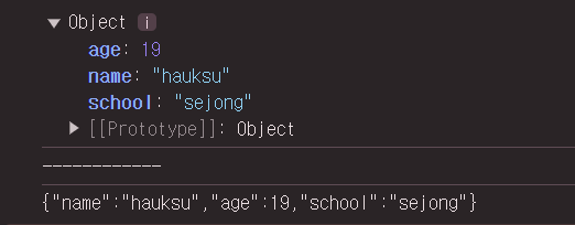 다음 코드를 실행해보면 json과 자바스크립트 객체의 차이를 볼 수 있다.