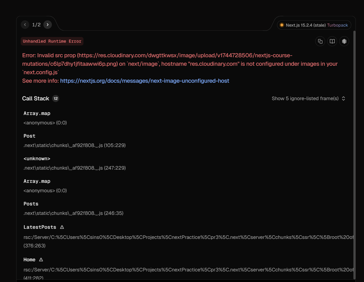이때 다음과 같은 오류가 발생하는데 nextConfig에서 출처를 허용시켜 주면 된다.