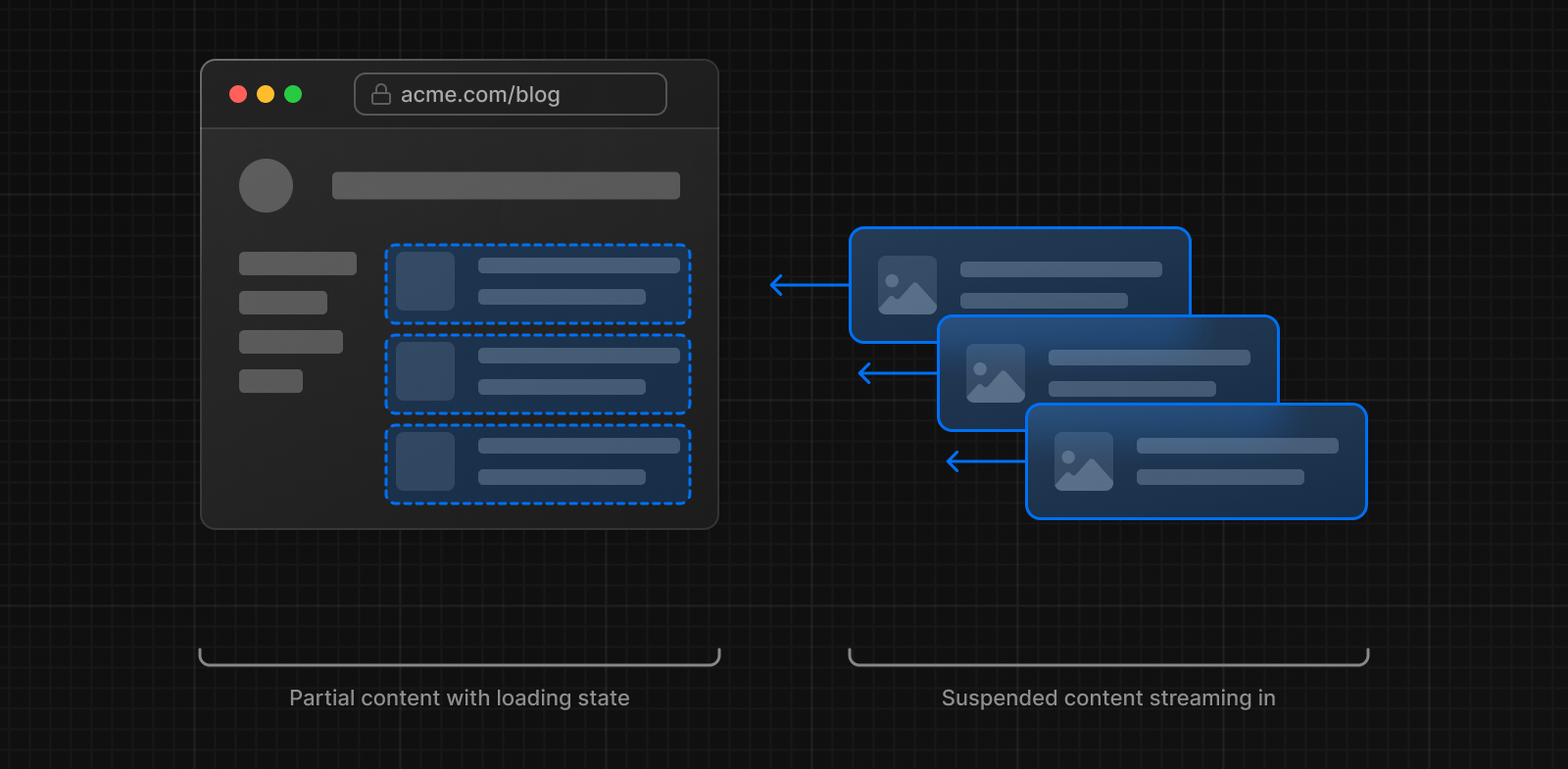 스트리밍을 통해 서버에서 UI를 점진적으로 렌더링할 수 있습니다. 작업은 청크로 나누어지고 준비되는 대로 클라이언트에 스트리밍됩니다. 이를 통해 전체 콘텐츠가 렌더링될 때까지 기다리지 않고도 사용자가 페이지의 일부를 즉시 볼 수 있습니다.