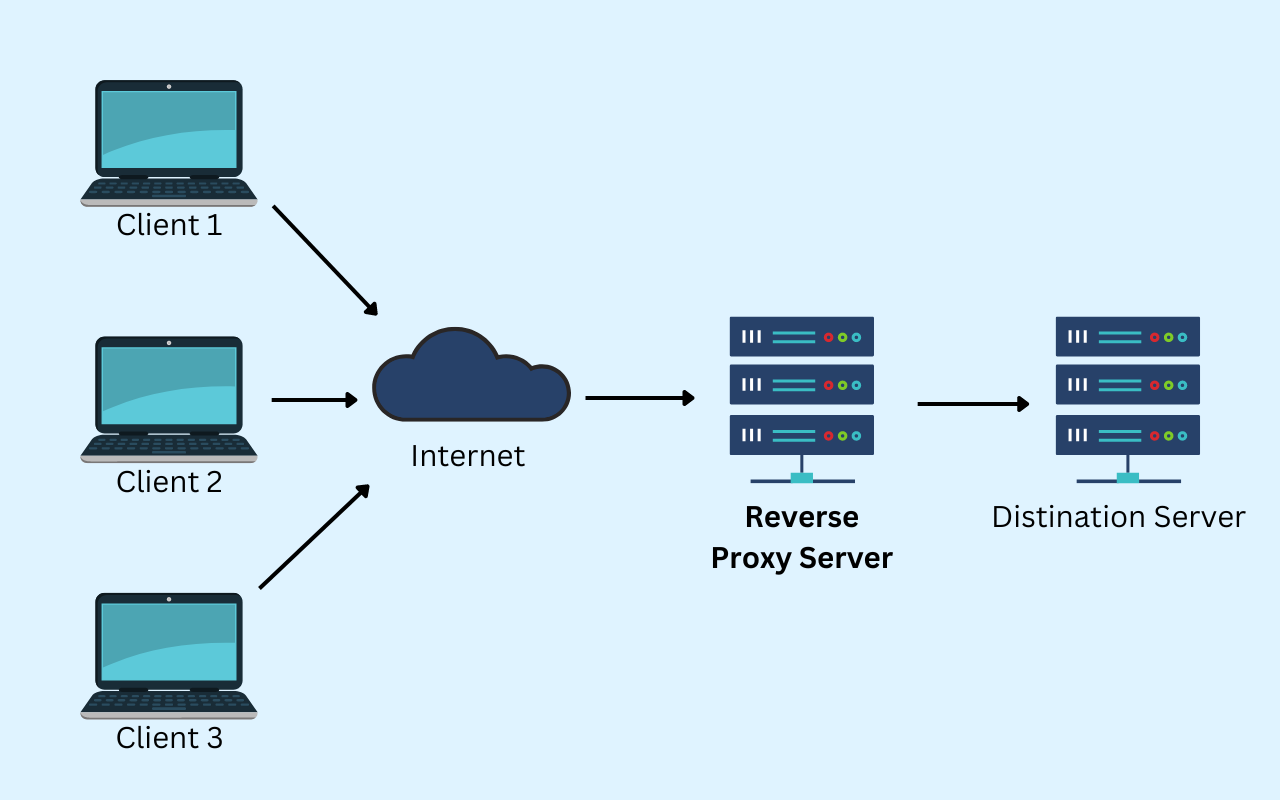 클라이언트의 요청을 서버가 직접 받지 않고, 리버스 프록시 서버가 해당 요청을 받아서 서버에 전달한 후 그 응답 값을 인터넷으로 전달한다. 클라이언트는 프록시 뒤의 서버의 존재를 모르게 된다.