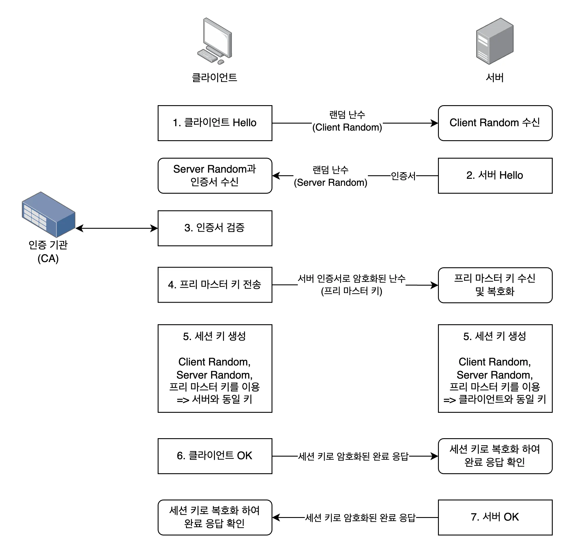 서버: 암호화된 프리 마스터 키를 복호화하고 프리 마스터 키, 클라이언트 랜덤 난수, 서버 랜덤 난수를 이용하여 세션 키를 생성합니다.