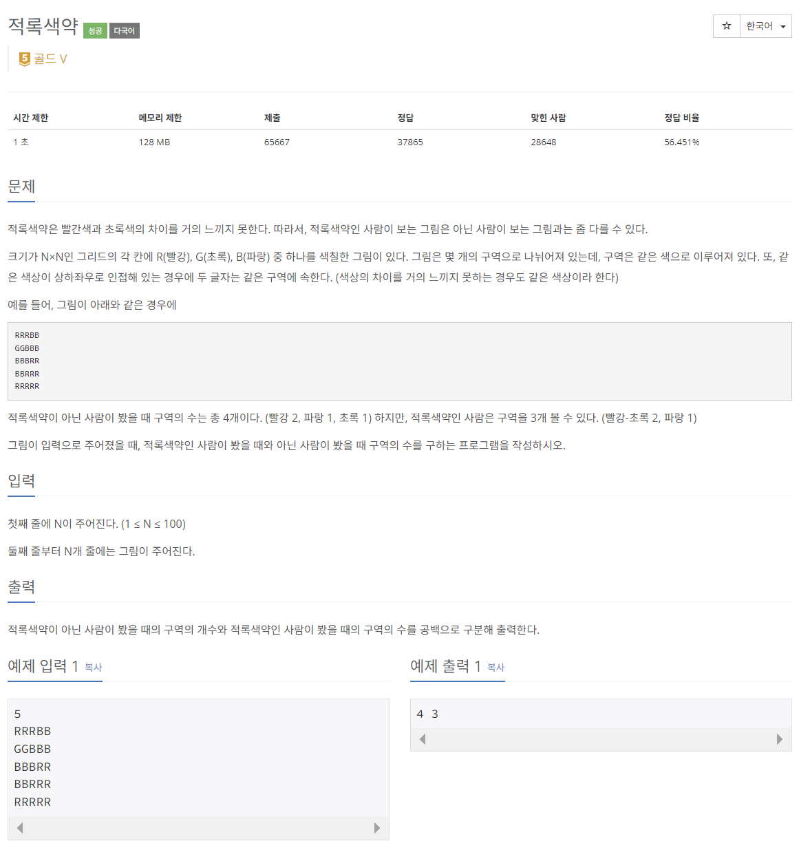 적록색약은 빨간색과 초록색의 차이를 거의 느끼지 못한다. 따라서, 적록색약인 사람이 보는 그림은 아닌 사람이 보는 그림과는 좀 다를 수 있다. 크기가 N×N인 그리드의 각 칸에 R(빨강), G(초록)